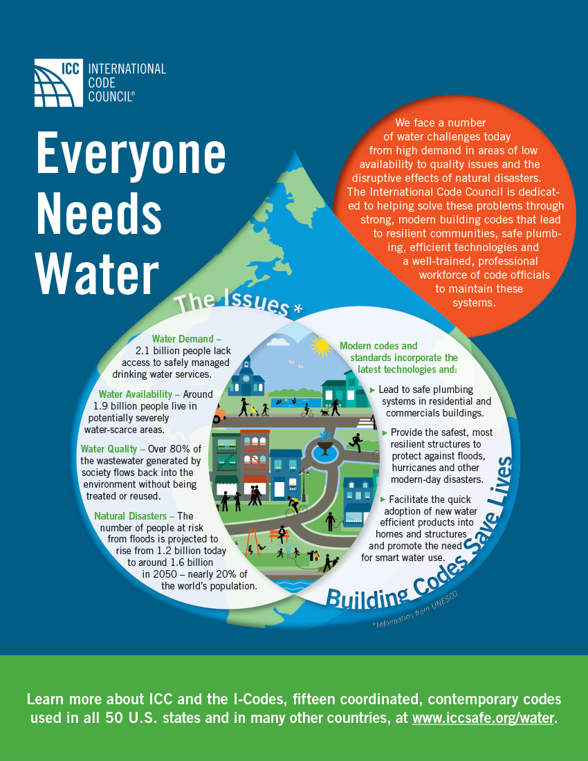 The International Code Council Family of Companies has several resources available to assist jurisdictions, manufacturers and the public with water conservation and efficiency. For decades, ICC’s codes and standards have addressed water-related issues and we remain committed to working with Member jurisdictions and industry partners to bring water efficient products to market, labeling new homes and structures as more water efficient, and spreading the word about the need for smart water use.