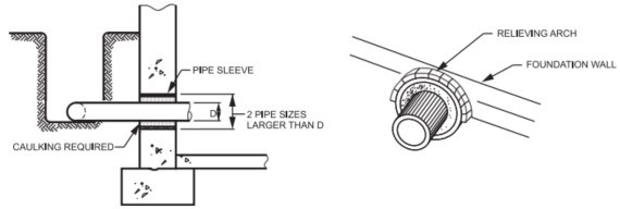 Piping installed through a foundation wall must be structurally protected from any transferred loading from the foundation wall. This protection must be provided by either a relieving arch or a pipe sleeve.