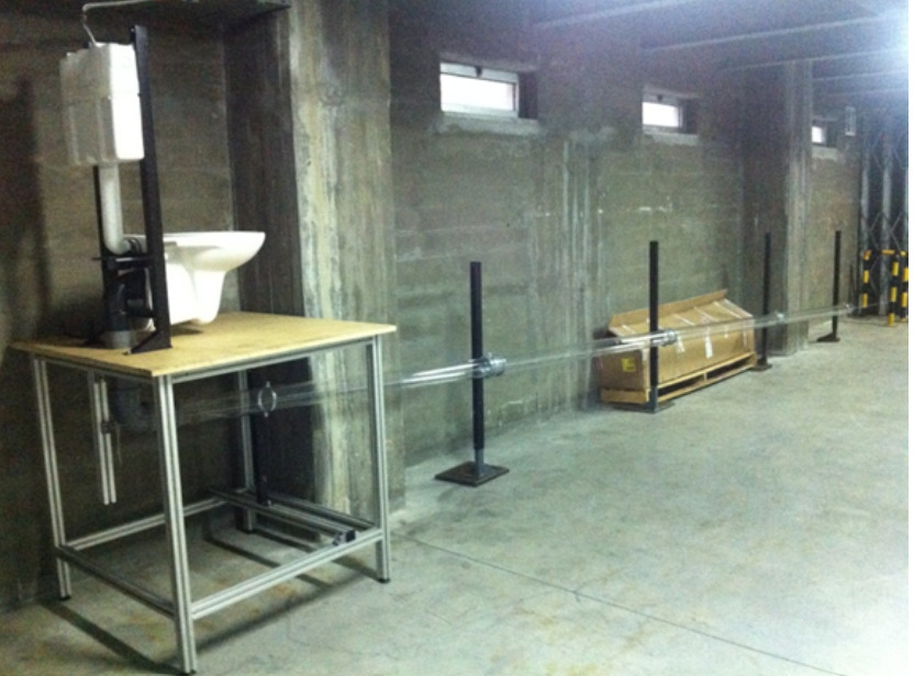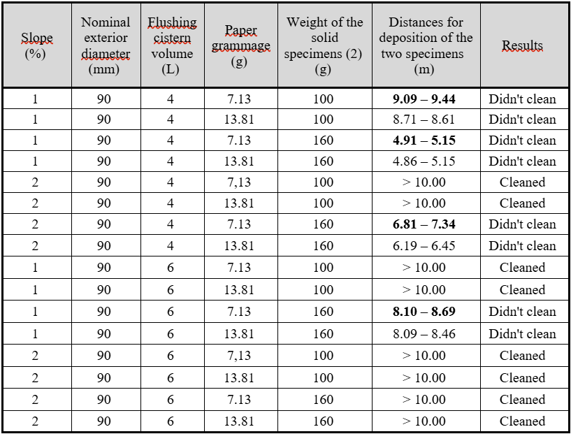 In these tests, solid specimens were used in accordance with European standards, and the objective was to analyze whether the discharge was sufficient, in each possible configuration, to carry the solids along the entire drainline (10 meters). To summarize the results, only the conclusions obtained for 90 mm drainlines, slopes of 1% and 2% and 4 and 6 L flushing cisterns are presented in the following table (Table 1).
