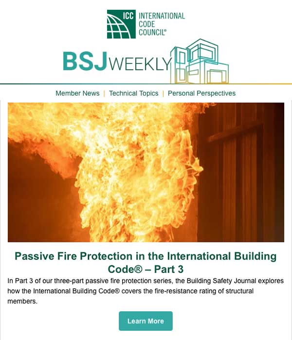 The Building Safety Journal (BSJ) Weekly is a free weekly newsletter from the International Code Council that compiles the latest news on the building safety and construction sectors, including fire-related news and updates, and is delivered to your inbox on Thursdays. Subscribe, here.