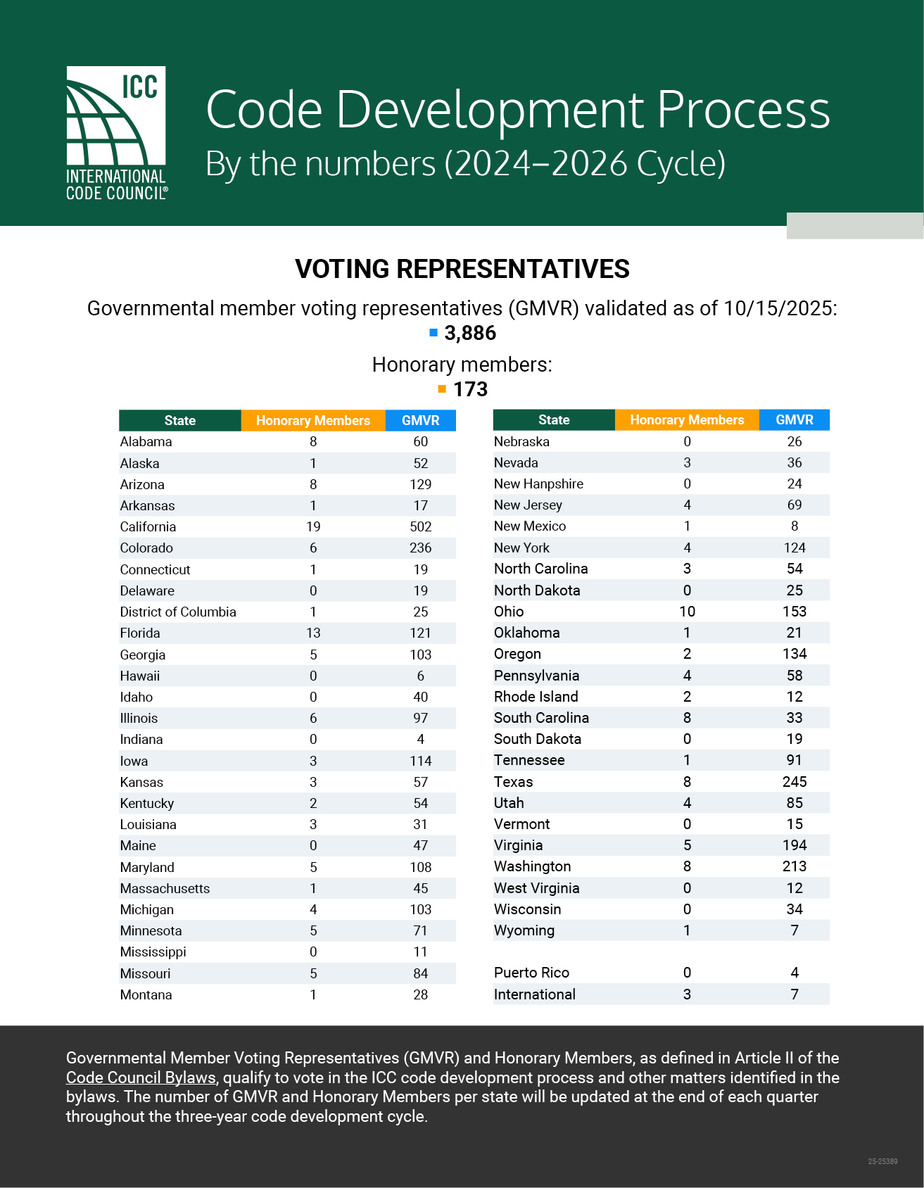 Important Notice: All validated International Code Council governmental member voting representatives (GMVRs) now remain active for the course of a three-year code development cycle. Any credentials validated and approved on or after January 1, 2024, are active through December 31, 2026, as long as the governmental member account is kept fully paid and current.* The primary contact may edit the voting roster during indicated times throughout the cycle. If no changes occur to an approved voter’s status, the credentials do not need to be revalidated until the next code development cycle.